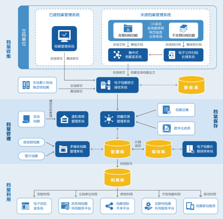 系統運用先進成熟的采集、存儲及檢索技術,采用J2EE開發架構,使用純網頁形式的外觀,界面優質美觀,功能強大,使用方便。該系統不僅提供各類實體檔案的條目信息管理,同時通過豐富的業務系統接口在線采集歸檔電子文件及其元數據信息,實現檔案系統與業務系統的無縫對接,并提供電子文件采集、整理、存儲、保護、檢索、鑒定、統計等全方位的系統功能,構建了實體檔案和電子檔案一體化管理的平臺;同時,系統通過功能強大的利用平臺,運用出色的權限控制體系和全面的檢索技術,在保證檔案安全保管的前提下,通過提供電子文件(檔案)的在線查閱和下載功能,實現檔案資源共享和便捷的在線利用。